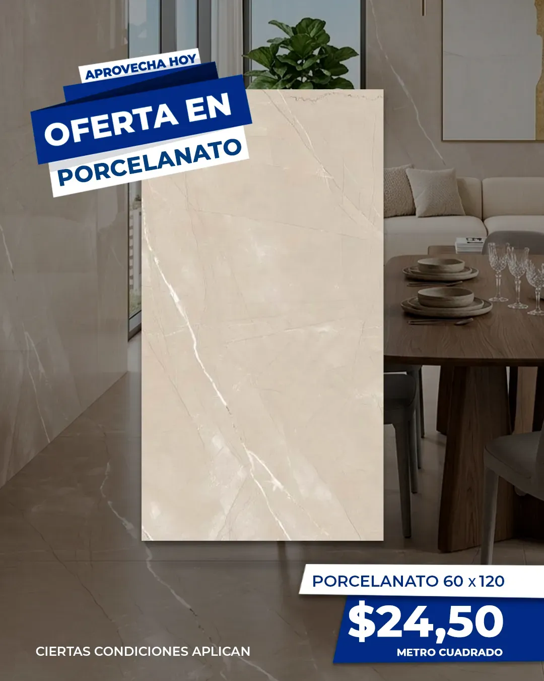 Renueva tus espacios con la elegancia y calidad del porcelanato 60x120. Aprovecha esta oferta especial a solo $24,50 el metro cuadrado y dale un toque de distinción a tu hogar. ¡No te pierdas esta oportunidad única para transformar tus ambientes!