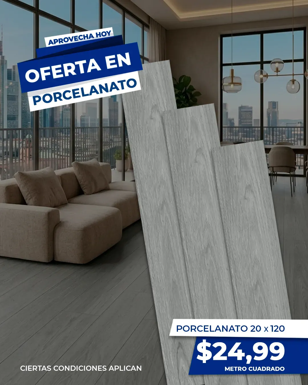 Renueva tus espacios con nuestro Porcelanato 20x120 efecto madera, a solo $24.99 el metro cuadrado. Aprovecha esta oferta única para darle a tu hogar un toque moderno y sofisticado. ¡No dejes pasar la oportunidad de transformar tus pisos con calidad y estilo incomparables!